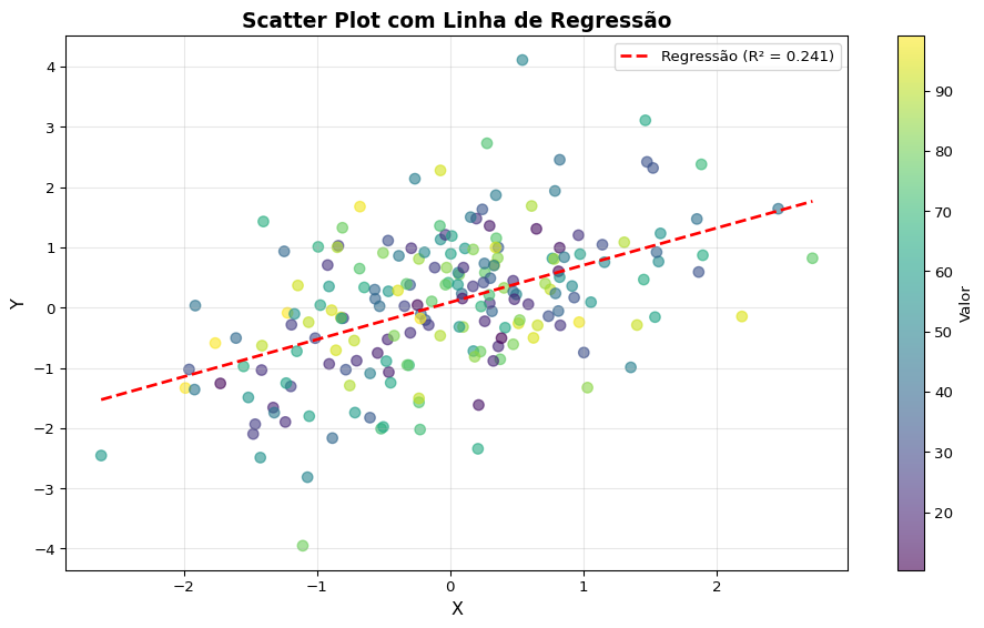 import numpy as npimport pandas as pdimport matplotlib.pyplot as pltimport plotly.express as pximport plotly.graph_objects as go# Configurar seed para reprodutibilidadenp.random.seed(42)# Criar dataset sintéticon_samples =200data = pd.DataFrame({'x': np.random.randn(n_samples),'y': np.random.randn(n_samples),'categoria': np.random.choice(['A', 'B', 'C', 'D'], n_samples),'valor': np.random.uniform(10, 100, n_samples),'tempo': pd.date_range('2024-01-01', periods=n_samples, freq='D')})# Adicionar correlaçãodata['y'] = data['y'] +0.5* data['x'] + np.random.randn(n_samples) *0.3print(data.head())print(f"\nShape: {data.shape}")